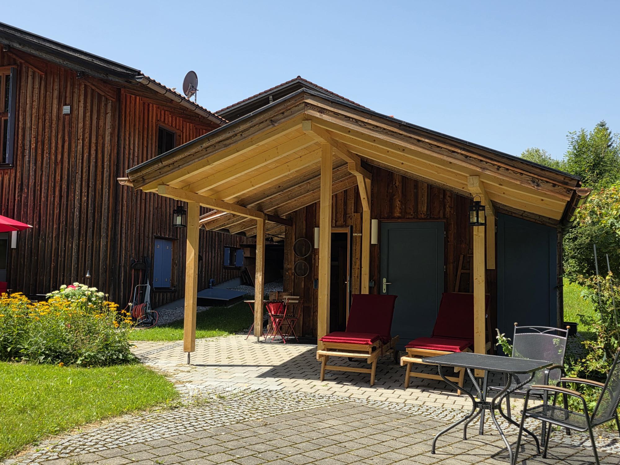 Hinter dem Gartenhaus finden Sie eine Aussendusche und ein Tauchbecken.